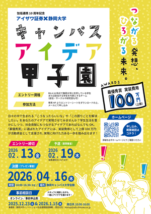 代表者が、2026年4月16日決勝(プレゼン審査)時点で、静岡大学に在学している学生であること(個人での応募も可)。
