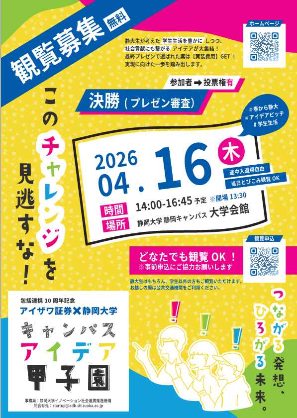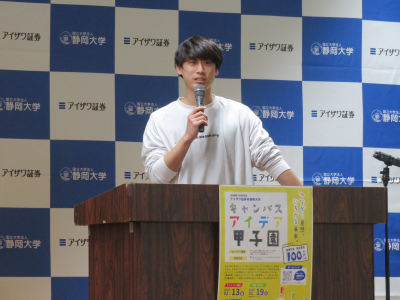 2026年4月16日(木)に「キャンパスアイデア甲子園 決勝」を開催しました。本イベントは、静岡大学とアイザワ証券の包括連携10周年を記念し、これまでに展開してきた多様な連携プログラムの成果を発信する場として企画されました。学生が日々のキャンパスライフの中で抱く「こんな仕組みがあれば便利」「この困りごとを解決したい」「これがあればもっと楽しくなる」といった思いを、実際のアイデアとして形にします。