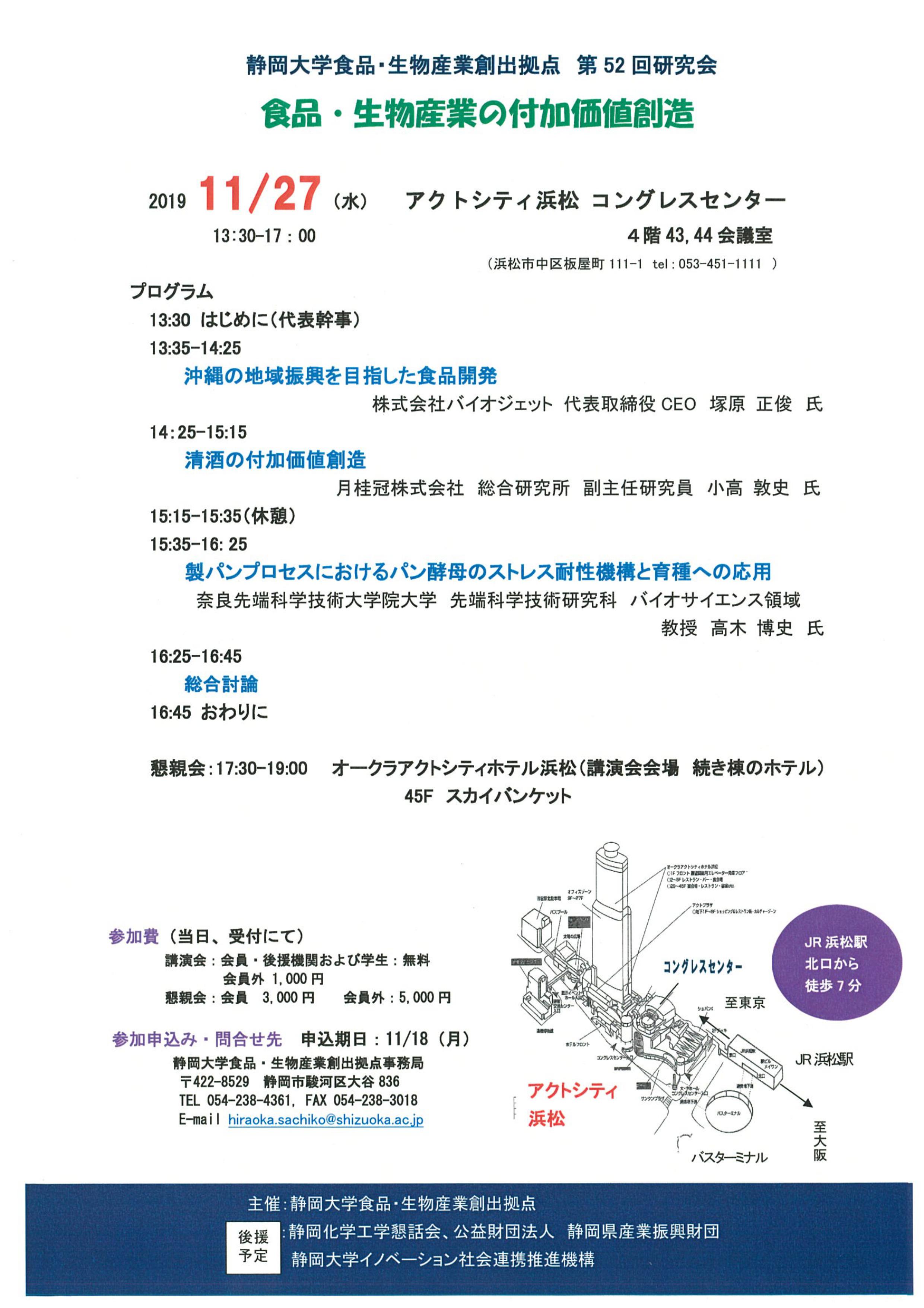| 問合せ・申込 | 静岡大学食品・生物産業創出拠点事務局 054-238-4361 hiraoka.sachiko@shizuoka.ac.jp 申込期日:11/18(月) |